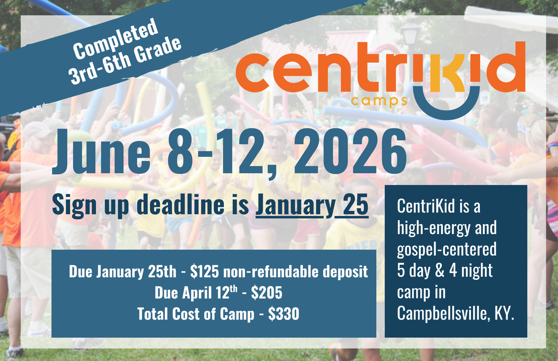 CentriKid Camp is for 3rd–6th graders to experience the time of their lives and learn more about the message of Jesus Christ! Centrikid is a high-energy gospel-centered 5 day 4 night camp in Campbellsville, KY. Registration is now open. The deadline to sign up is January 25th with a $125 non-refundable deposit. This secures your spot for our camp trip to Campbellsville University. For more information contact Tina Sparks, Minister of Children and Families or Lori Stringer, Minister of Preschool and Families.